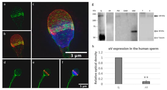 Detection of αV integrin in human spermatozoa and reproductive tissue. (a–c) The αV integrin (green) localization on acrosome-intact ejaculated sperm was visualized by SIM and confined to the PM, OAM, and IAM overlaying the apical acrosome and equatorial segment. (d–f) The αV integrin (green) localization after the acrosome reaction was captured by confocal microscopy and depicted in IAM and the PM overlaying the equatorial segment, post-acrosomal region, neck, and tail. Acrosomal status was visualized with PNA staining (red); Hoechst (blue) was used for detection of nucleus. Scale bars represent 3 µM (a–c) and 5 µM (d–f). (g) Western blot immunodetection of αV integrin in extracts from ejaculated sperm (Ej), acrosome-reacted sperm (AR), PM, OAM, and IAM fractions from ejaculated sperm, testis (T), and epididymis (E). Antibody detected bands with a molecular weight of 130 kDa (gray arrow). (h) Western blot densitometry analysis in protein extracts shows a decreased expression of αV integrin (p < 0.02; **) in acrosome-reacted (AR) sperm in comparison with the ejaculated (Ej) sperm.