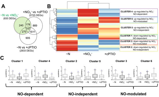 Pairwise comparison between nitrate-supplied plants (+NO3−) and NO-scavenged ones (+NO3− + cPTIO) resulted in 2725 DEGs significantly responsive to cPTIO treatment, while pairwise comparison between nitrate-deficient plants (−N) and NO-scavenged ones (+NO3− + cPTIO) resulted in 2833 DEGs. DEGs identified in these two pairwise comparisons were then compared to the 835 DEGs previously found [] as directly regulated by the nitrate provision (+NO3−), if compared to N-starvation (−N; Figure 1A), analyzing how they respond to the other treatments (−N; +NO3− + cPTIO). The 3305 DEGs that seemed responsive only to cPTIO, but not directly to nitrate application, were not further considered in this study (Figure 1A).
