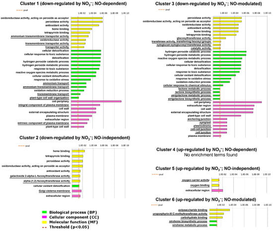 Enrichment analysis of DEGs clustered in 6 groups using gProfiler. The figure shows the GO categories overrepresented among genes down-regulated by nitrate provision and NO-dependent (cluster 1), down-regulated by nitrate and NO-independent (cluster 2), down-regulated by nitrate and NO-modulated (cluster 3), up-regulated by nitrate provision and NO-independent (cluster 5), or up-regulated by nitrate and NO-modulated (cluster 6). The specific and unique terms for each group are underlined. No enriched terms were found among DEGs up-regulated by nitrate provision and NO-dependent (cluster 4).