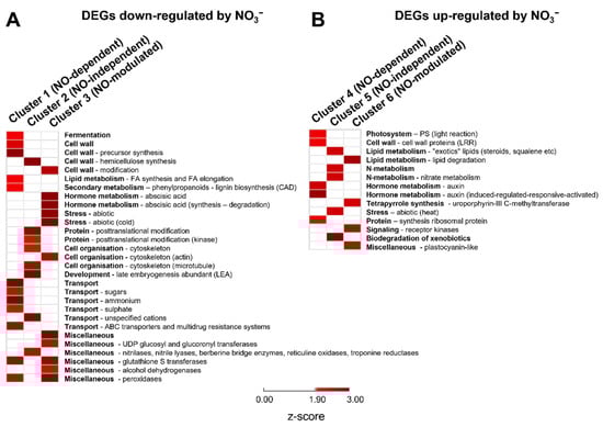 In addition to NO-dependent and independent DEGs, two additional gene clusters (3 and 6) were detected, including 219 DEGs in which the effect of the nitrate provision is further amplified by the NO scavenger application. Cluster 3, which includes 97 DEGs down-regulated by nitrate provision, and cluster 6, with 122 DEGs up-regulated by nitrate supply, were defined as NO-modulated groups. Even if NO is not necessary for the NO3−-transcriptional regulation of these genes, NO scavenging resulted in a magnified NO3−-induced up- or down-regulation, indicating that their transcriptional regulation by nitrate does not depend on NO production, even thought they could be regulated by NO regardless of nitrate. Therefore, in this context, they should be fully considered as nitrate regulated in an NO-independent way.