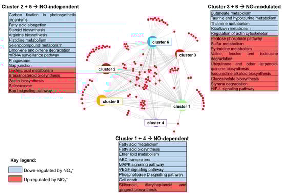DEGs were assigned to 55 pathways for cluster 1, 57 pathways for cluster 2, 33 pathways for cluster 3, 21 pathways for cluster 4, 48 pathways for cluster 5, and 54 pathways for cluster 6. Some of these pathways were specifically reconstructed in each cluster, leading to suppose NO-dependent and NO-independent regulation processes, while other pathways were variably shared among two or more clusters (Figure 4).