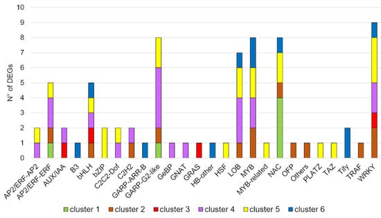 The presence of transcription factors (TFs) among DEGs was then evaluated with a targeted search using the iTAK database (Figure 5). A total of 53 TF-encoding genes from 26 TF families were globally identified. Cluster 1 includes 6 of them from 3 TF families, cluster 2 counts 13 of them from 11 TF families, cluster 3 comprises only 4 TF-encoding genes from 4 TF families, cluster 4 includes 20 of them from 12 TF families, cluster 5 exhibits 21 TF-encoding genes from 14 TF families, and cluster 6 encloses 11 TF-encoding genes from 9 TF families. Among the identified TF families, NAC members seemed specific and highly represented in cluster 1, the GARP-G2-like family appeared the most representative for cluster 4, WRKY appeared the most representative TF family for cluster 5 (even it was found also in other clusters), and the Tify family for cluster 6. Nevertheless, bHLH and WRKY appeared equally shared among all clusters, except for cluster 1, while LOB and MYB were common among clusters 5, 4, 2, and 6, suggesting a universal involvement of these four TF families in the maize root response to nitrate regardless of NO action. bZIP, HSF, MYB-related, PLATZ, and TAZ TF-families appeared only in cluster 5, GeBP and GNAT only in cluster 4, OFP and TRAF only in cluster 2, GRAS only in cluster 3, and B3, GARP-ARR-B, and Tify only in cluster 6.