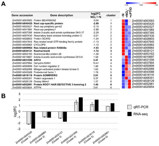 As already stated, N availability affects root development in an extraordinarily complex way, by influencing its architecture at various key points and depending on many factors. The untargeted approach utilized here allowed us to identify several transcripts putatively controlling root growth and development and similarly distributed among clusters 1, 2, and 3 (Figure 6A). For six genes randomly selected among all clusters, the gene expression profiles where further confirmed by qRT-PCR (Figure 6B).