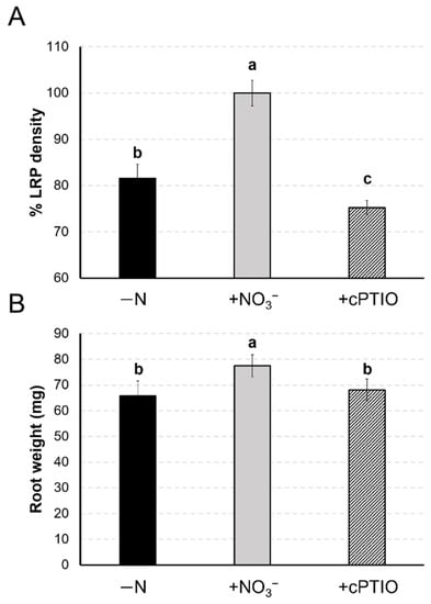To dissect the direct effect of NO on the maize seedlings root growth, lateral root density (LRP) and root weights were measured in response to the NO scavenger cPTIO (Figure 7). Nitrate-provided plants always showed a significantly higher number of LRP (+18.4%) compared to plants grown in an N-free solution (−N), as already reported by Ravazzolo et al. []. However, when cPTIO was provided together with nitrate, a marked decrease in LRP density (−24.8%) was noticed (Figure 7A). As far as the root biomass accumulation was concerned, a significant increase in their fresh weights was observed in response to NO3− (+20%), but the provision of cPTIO restored the −N phenotype (Figure 7B).