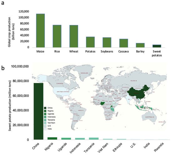Global production of major crops including sweet potato. (a) The production of the top eight major crops in the world; (b) the global distribution and the top ten sweet potato-producing countries in 2018. The darkness of the color reflects the production volumes. The production numbers were generated according to the Food and Agriculture Organization (FAO) Statistics 2019.