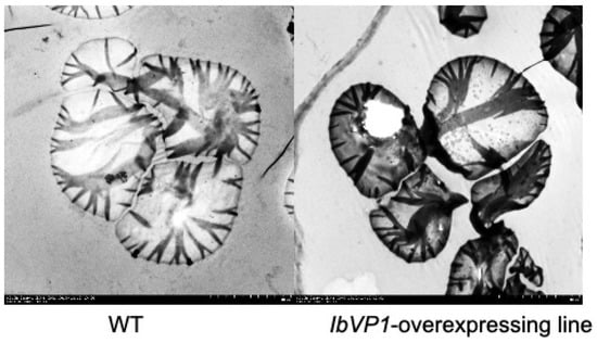 Ultrastructure of starch granules from wild-type and engineered sweet potato. Starch granules were examined by a transmission electron microscope (TEM). In wild-type plants, the starch granules show typical morphology of “zebra stripes” that are crystalline lamella, which may be associated with double helical amylopectin [84]. The granules and the stripes are darker and thicker in starch from the IbVP1-overexpressing lines. In addition, the hilum cracks (centric holes) in the starch granules of the transgenic line become more dominant, likely affecting the water absorption and swelling of the starch. The cracking on hilum is also observed when downregulating SSII. IbVP1, H + -pyrophosphatase. Scale bar, 5 μm.
