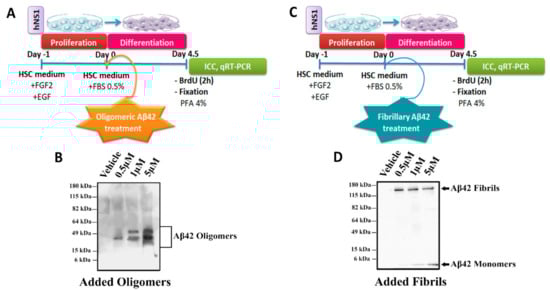 Schematic representation of the experiments and WB analysis. Schematic view of hNS1 cells’ differentiation protocol (See Materials and Methods section) for (A) Aβ42 oligomers and (C) Aβ42 fibrils. (B) Representative WB analysis of Aβ42 forms (using 4G8 antibody) present in extracellular medium used for oligomeric Aβ42 treatment. (D) Representative WB analysis of Aβ42 forms (using 4G8 antibody) present in extracellular medium used for fibrillary Aβ42 treatment.