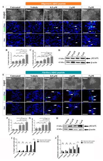 We finally analyzed the abundance of γH2AFX. As shown in Figure 2D, treatment with oligomeric Aβ42 induced a slight increase in γH2AFX. However, treatment with fibrillary Aβ42 provoked a clearly dose-dependent increase in γH2AFX, mainly at 5 µM, indicating the presence of DNA damage and confirming the data observed for cell death (Figure 2H).