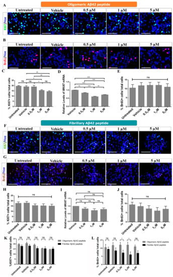 Moreover, results for fibrillary Aβ42 peptide showed that the percentage of Ki67+ cells in the control groups represented 17.8 ± 1.4% for the untreated group and 18 ± 1.5% in the vehicle group (Figure 3F,H). These results were similar for the groups treated with 0.5 µM (15.6 ± 1.6%; p > 0.05; n = 3), 1 µM (15.4 ± 1.9%; p > 0.05; n = 3), and 5 µM (15.2 ± 1.7%; p > 0.05; n = 3) (Figure 3H). The results were confirmed by qRT-PCR (Figure 3I). Finally, after a 2 h pulse of BrdU (Figure 3G), our results confirmed that 9 ± 1.5% of control cells incorporated BrdU. After treatment with fibrillary Aβ42, no significant differences in the number of BrdU+ cells were observed at the different concentrations tested: 7.2 ± 1.7% at 0.5 µM, 6 ± 1.8% at 1 µM, and 7 ± 2% at 5 µM (p > 0.05; n = 3) (Figure 3J). Contrary to the effects observed for oligomeric Aβ42 peptide, all these results suggest that Aβ42 peptide in its fibrillary form does not appear to have significant effects on the proliferation of hNS1 cells (Figure 3K,L).