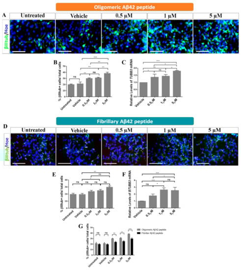 Furthermore, results obtained after the analysis of cell fate specification revealed that there were also significant differences between the groups treated with the fibrillary Aβ42 peptide and the control groups for β-III-tubulin marker. We observed a significant increase in the number β-III-tubulin+ cells after treatment with 1 µM and 5 µM (23.7 ± 0.7%; p > 0.05 at 0.5 µM, 25 ± 0.7%; * p < 0.05 at 1 µM and 29.8 ± 0.8%; ** p < 0.01 at 5 µM; n = 3) compared to control groups (untreated: 19.7 ± 1.6%, vehicle: 19.5 ± 1.6%) (Figure 4D,E), and these results were confirmed by qRT-PCR (Figure 4F). According to these results, oligomeric and fibrillary Aβ42 peptides increase neurogenesis of hNS1 cells, with a greater effect being observed in oligomers under our experimental conditions (Figure 4G).