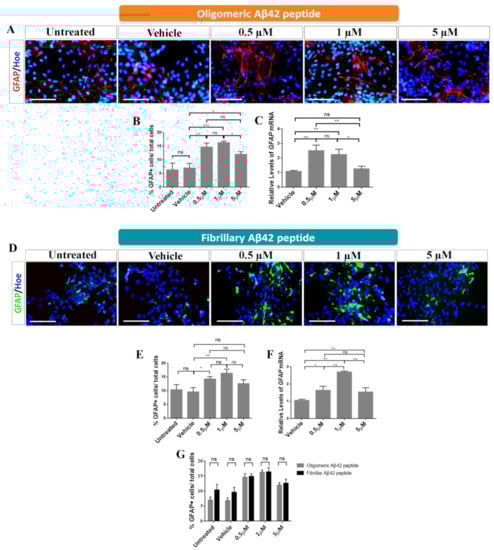 Regarding fibrillary Aβ42 peptide, we also observed significant differences in GFAP+ cells in treated groups compared to control groups (untreated: 10.4 ± 1.9%, vehicle: 9.6 ± 1.6%) (Figure 5D,E). At 0.5 µM, an increase in the number of GFAP+ cells (14.3 ± 0.9%; * p < 0.05; n = 3) was observed (Figure 5E). The most significant effect appeared when hNS1 cells were treated with 1 µM of fibrillary Aβ42 peptide (16.4 ± 1.5%; ** p < 0.01; n = 3). This then declined at 5 µM (12.6 ± 1.4%; p > 0.05; n = 3) (Figure 5E). These results were confirmed by qRT-PCR experiment (Figure 5F). This suggests that both oligomeric and fibrillary Aβ42 peptides have positive effects on gliogenesis in a dose-dependent manner, especially at 0.5 µM and 1 µM (Figure 5G).