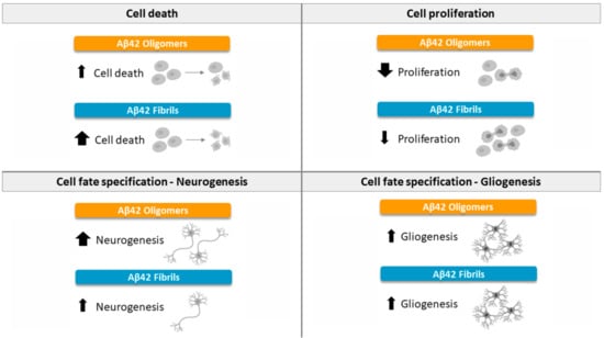 Summary of the effects of Aβ42 peptide (oligomeric and fibrillary) on cell death, proliferation, and differentiation of NSCs. Positive effects are indicated by upward arrows. Negative effects are indicated by downward arrows.