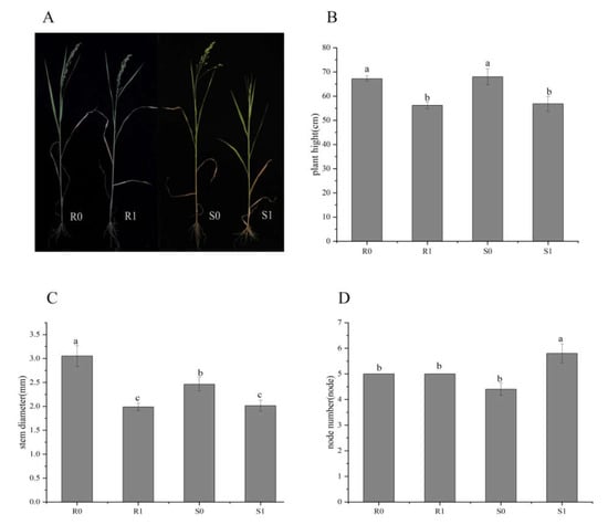 Phenotypic differences between four broomcorn millet samples: R0 and S0 were uninoculated controls; R1 and S1 were inoculated with Sporisorium destruens. (A) Phenotype at heading stage; (B) Plant height (cm); (C) Stem diameter (mm); (D) Node number. The values are presented as means (n = 5) with standard deviations. Values with different letters within the same figure were significantly different (p < 0.05). Data represents mean ± SD and different letters (a, b, and c) indicate significant differences (p < 0.05) in each samples.