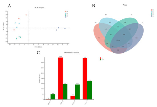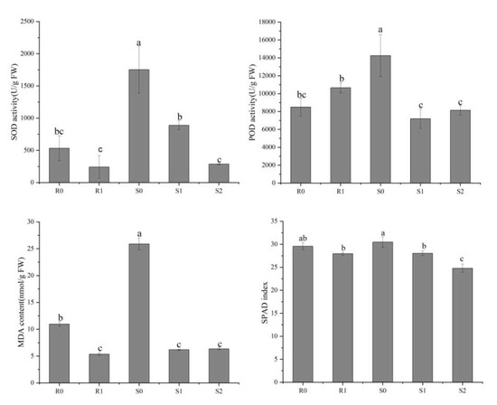 SOD and POD activities, as well as the MDA content, in the leaves under the ears of R0, R1, S0, S1, and S2, were determined using commercial detection kits (Solaibao Technology Co., Ltd., Beijing, China), according to the manufacturer’s instructions. The SPAD index was determined using a non-invasive, handheld meter (SPAD-502, Konica Minolta, Tokyo, Japan).