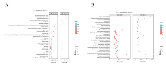 To identify the DEGs in broomcorn millets, transcript expression levels were calculated according to the transcripts per million reads method. RNA-Seq by Expectation-Maximization was used to quantify the gene abundance (http://deweylab.biostat.wisc.edu/rsem/ (accessed on December 2020)). Differential expression analysis was performed using DESeq2, and genes with |log2FC|≥1 and p ≤ 0.05 (DESeq2) were used as DEGs. Functional enrichment analysis of GO and KEGG was performed to identify the significant terms and pathways in terms of the Bonferroni-corrected p-value ≤ 0.05, compared with the reference genome (http://bigd.big.ac.cn/gwh/Assembly/131/show (accessed on November 2020)). GO enrichment terms and KEGG enrichment pathways were analysed using GOATOOLS (https://github.com/tanghaibao/goatools (accessed on December 2020)) and KEGG Orthology-Based Annotation System (http://kobas.cbi.pku.edu.cn/download.php (accessed on December 2020)).