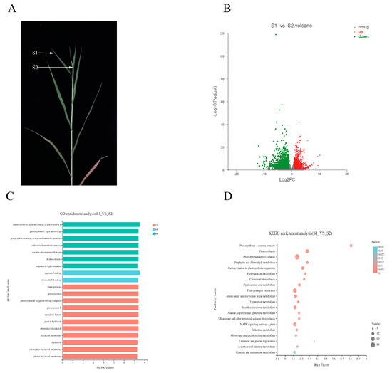Difference between S1 and S2 in diseased plant. (A) The performance of S1 and S2 and their position on the diseased plant. (B) Distribution of DEGs in S2 compared to S1. (C) GO enrichment analysis of DEGs in S1 vs. S2. (D) KEGG enrichment analysis of DEGs in S1 vs. S2.