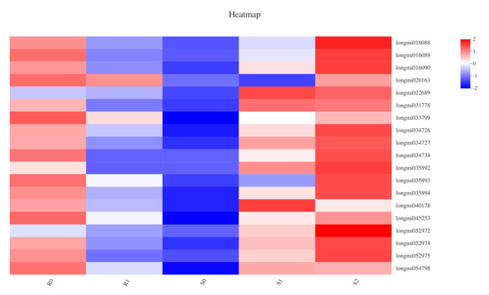 In plant hormone signal transduction, the jasmonate ZIM (JAz)-domain-containing protein family is a key component of the jasmonic acid (JA) signalling pathway [28]. In the JAz family, 19 genes in five samples of two broomcorn millets were defined as DEGs (Figure 6). DEGs in the two varieties showed different trends: in BM, compared with R0, seven DEGs were down-regulated in R1; in S0 vs. S1, 18 DEGs were defined as being up-regulated; the 9 DEGs annotated in the JAz family of S1 vs. S2 included one down-regulation and eight up-regulations. After Sporisorium destruens infection, the expression of JAz may be related to the resistance of broomcorn millet; in BM varieties, all the DEGs annotated in the JAz family were down-regulated, whereas in NF, most DEGs were up-regulated. There were three DEGs annotated in the GH3 auxin-responsive gene family: one DEG was defined as up-regulated in S0 vs. S1, and two DEGs were down-regulated in S1 vs. S2. Furthermore, the expression of 12 genes in the auxin-responsive protein (IAA) family had changed: there were four up-regulated DEGs and one down-regulated DEG in S0 vs. S1, and two up-regulated DEGs and five down-regulated DEGs in S1 vs. S2 (Supplementary Material file 5). In the resistant variety of broomcorn millet, no DEGs were annotated in the IAA and GH3 families.