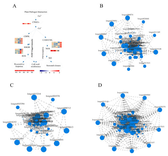 DEGs enriched in plant–pathogen interaction pathway. (A) DEGs related to Ca2+ in plant–pathogen interaction pathway. Expression related network diagram of DEGs enriched in plant–pathogen interaction pathway in R0 vs. R1 (B), S0 vs. S1 (C), and S1 vs. S2 (D).
