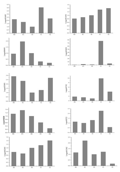 Selecting ten DEGs for real-time polymerase chain reaction (RT-PCR) to confirm the authenticity of the transcriptome results. These genes were annotated in pathways of photosynthesis, plant hormone signal transduction, phenylpropanoid biosynthesis, WRKY transcription factors, oxidation-reduction processes, plant–pathogen interactions, and alpha-linolenic acid metabolism. The primers for DEGs were designed and synthesised by Majorbio (Shanghai, China). Synthesis of cDNA was performed on HiScript Q RT SuperMix for qPCR (+gDNA wiper). RT-PCR was performed using the ABI7500 Real-time PCR System (Applied Biosystems, Waltham, MA, USA) with SYBR Premix Ex Taq II (Tli RNaseH Plus) and ROX plus (Takara Bio, Kusatsu, Japan). Expression levels of each gene were normalised relative to that of S0, and the fold-change in expression was calculated using the 2−ΔΔCT method.