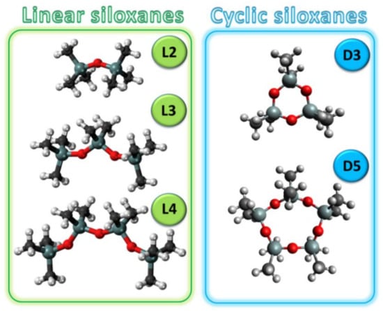 In the studies, the COSMO-RS model was used for the screening of DESs, which were characterized by the highest affinity to siloxanes. The screening tests were prepared for the most common siloxanes in biogas, i.e., hexamethyldisiloxane (L2), octamethyltrisiloxane (L3), decamethyltetrasiloxane (L4), hexamethylcyclotrisiloxane (D3), and decamethylcyclopentasiloxane (D5), which represented linear and cyclic siloxanes [,,] The structures of siloxanes are presented in Figure 1.
