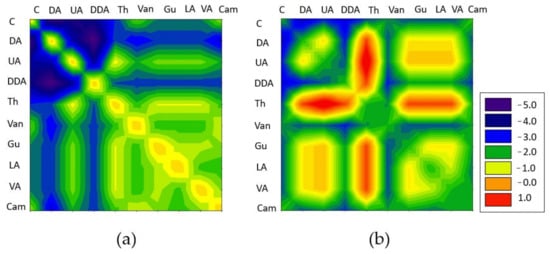 The results of the DESs’ density are presented in Figure 8b. The lowest density was obtained for C:DA (1:1), and the highest for C:UDA (1:1). With the increasing of the temperature from 20 to 70 °C, only slight changes in density could be observed. The largest visible differences were noticeable for C:DA (1:1) (about 0.002), and the lowest for C:DDA (3:1). The densities of the studies DES showed lower densities than water, ranging from 0.905 to 0.935 g/cm3.