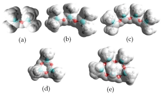 ESP mapped onto total electron density with an isovalue of 0.001 for siloxanes, i.e., (a) L2, (b) L3, (c) L4, (d) D3 and (e) D5. Blue color represents positive charges, red color represents negative charges, and white color represents neutral charges.
