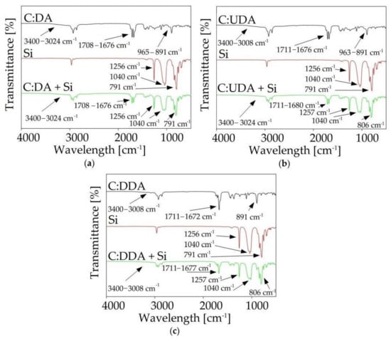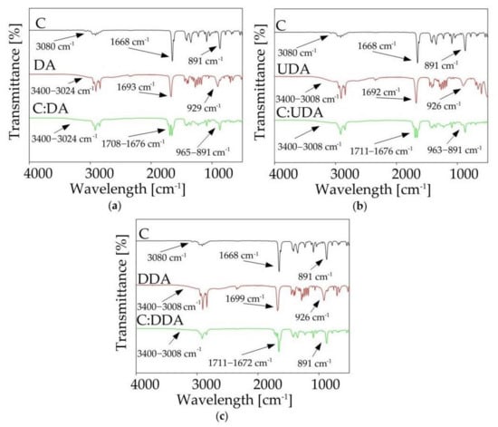 FT-IR analysis provided a lot of important information about the structure of the synthesized DES. Based on the peak shifts, it was possible to determine which groups of individual substances were involved in the formation of DES, as well as to determine whether by-products were formed during the synthesis process. Figure 6 shows the spectra of pure substrates (HBA and HBD) and synthesized DESs. In the C:DA (1:1) spectrum, shifts of the stretching carbonyl band vibrations towards higher values, in comparison to both pure HBA (from 1693 cm−1 to 1708 cm−1) and HBD (from 1668 cm−1 to 1676 cm−1), were observed. This indicates that both groups, –COOH from DA and =O from C, were involved in the formation of a hydrogen bond. In addition, the γO-H deformation band (929 cm−1), which could be observed in the DA spectrum, underwent distortion in the DES spectrum. In the DES spectrum, wide peaks within the wavelength number range from 965 to 891 cm−1 were observed. The deformation of the band of the -OH group confirmed the fact that it was involved in the formation of hydrogen bonds. Similar shifts were also observed in the spectra of the remaining DESs (C:UDA (1:1), and C:DDA (3:1)).