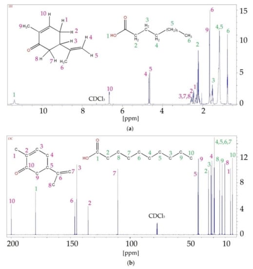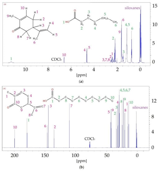 In this study, 13C NMR analysis was also performed. The observed shifts likewise indicated the formation of hydrogen bonds between the carvone and the fatty acids. This was confirmed by the C1 shifts in the carboxyl group in the acids and C10 in the carbonyl group in the carvone. In addition, shifts of carbons (C2 and C9) that were directly connected to the hydroxyl and carbonyl groups were also visible.