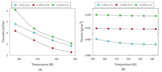DES density and viscosity are physicochemical parameters that have a key influence on mass transfer processes []. Therefore, the dynamic viscosity of absorbents should be as low as possible, so that DES can be used for absorption processes. These are also parameters that largely depend on the HBD and HBA that are used for the DESs’ synthesis.