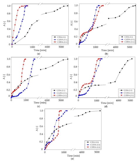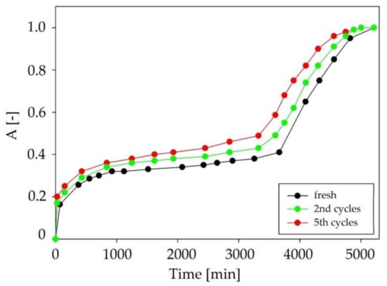 In addition, C:DA (1:1) showed the ability to complete five regeneration cycles without changing the efficiency of the absorption process. The absorption curves for successive absorption cycles are presented in Figure 17. In comparison with the data in the literature, the obtained results indicated a high efficiency of the regeneration process of DES, without a significant loss of absorption capacity. For example, the adsorption capacity of active carbon decreased by 65% after three siloxane adsorption/desorption cycles at 90 °C []. In other studies, a 30% reduction in adsorption capacity was observed after one cycle of the process carried out at a temperature of 160 °C for 4 h [].