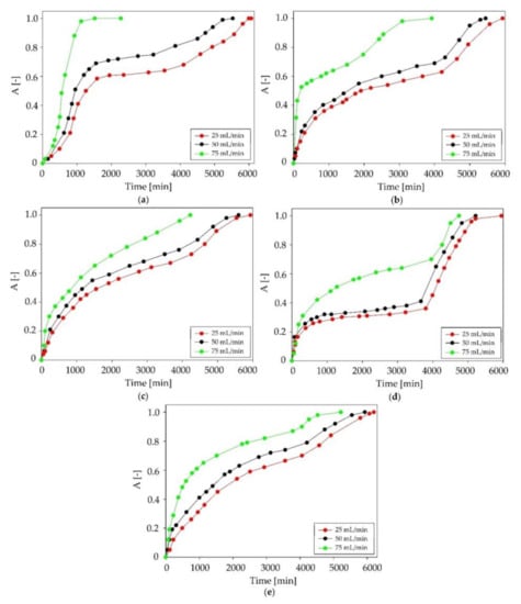 Absorption curves of C:DA (1:1) at various biogas flow rates in the range of 25–75 mL/min for individual siloxanes: (a) L2, (b) L3, (c) L4, (d) D3 and (e) D5.