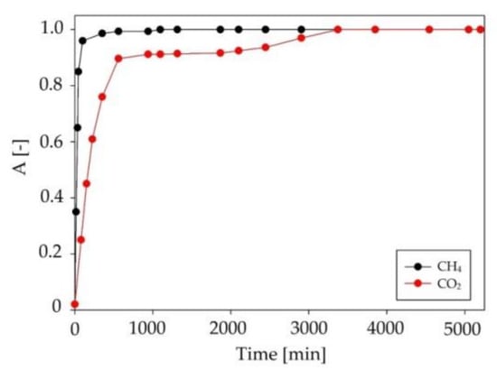 The composition of the main components of the model biogas stream (methane and carbon dioxide) was monitored by means of gas chromatography coupled with a thermal conductivity detector (GC-TCD). The oven temperature was 40 °C, the detector temperature was 80 °C, the flow rate of the carrier gas (He) was 5 mL/min, and 200 μL of the gaseous sample was introduced into the column. Calibration was performed in the range of 5–50% v/v and 30–70% for CO2 and CH4, respectively. The method validation was performed as described above. The following results were obtained: LOD in range of 1–5% v/v; LOQ in the range of 3–15% v/v; R2 > 0.981; RSD < 6%.