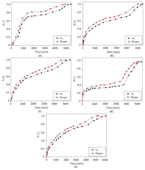 The methane and carbon dioxide contents in the biogas stream were monitored by means of gas chromatography (SRI Instruments, Earl St, Torrance, CA, USA) coupled with a thermal conductivity detector (TCD, SRI Instruments, Earl St, Torrance, CA, USA), and a packed column (Porapak Q 80/100, 2 m × 2 mm) (Restek, Bellefonte, PA, USA). In the investigations, the PeakSimple data system version 4.09 (exclusively licensed by SRI Inc., McLean, VA, USA) was used.
