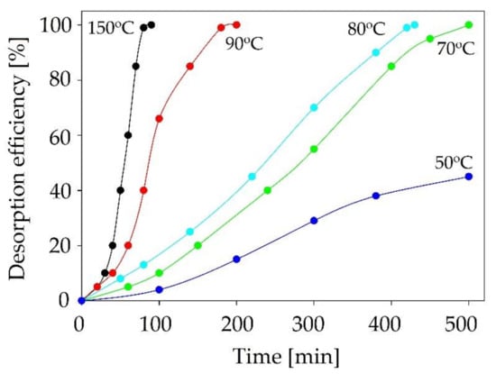 From an industrial point of view, the absorbent regeneration process is extremely important. The possibility of multiple applications of sorption material significantly reduces the process costs []. On the other hand, the regeneration process is considered to be the main disadvantage of the absorption process due to its high energy consumption. Therefore, the desorption step should be optimized. In the studies, the desorption process was performed using the pure nitrogen bubbling process at elevated temperatures in range of 50–150 °C. The absorbent regeneration process was performed for the best absorbent, C:DA (1:1) (Figure 15). The obtained results indicated that the highest desorption efficiency was observed for the process at a temperature of 150 °C. The complete siloxanes desorption was obtained after 90 min. Along with the decrease in process temperature, the desorption time was extended (up to 500 min at 70 °C). Below 70 °C, the desorption process was ineffective.