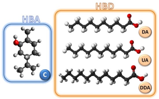 The results of the 1H NMR analysis confirmed the formation of hydrogen bonds between HBA (carvone) and various HBDs (i.e., DA, DDA and UDA). Spectra are presented in Figure 7 and Figures S1 and S2. The detailed values of chemical shifts are presented in Table 1, Tables S1 and S2. In the 1H NMR spectra, shifts of hydrogen (H1) from the hydroxyl group that was present in the structure of carboxylic acids, towards lower values, were observed for DA (from 11.87 to 11.38 ppm) and DDA (from 11.87 to 10.69 ppm). For UDA, the shift towards higher values, from 10.4 to 11.43 ppm, was observed. The greatest differences in shifts could be observed for DES with DDA (about 0.2 ppm), and the lowest for DES with DA (about 0.1 ppm). This indicated that in DES composed of carvone and DDA, the strongest H-bonding occurred. All changes in the hydrogen signal from HBA were shifted towards lower values, except for H8. Hydrogen H8, which was shifted towards higher values in the DES spectrum, was located close to the oxygen atom from the carbonyl group. This may indicate that hydrogen bonds were formed in the vicinity of H8.