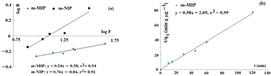 Firstly, the characterization of the adsorption sites was carried out. The adsorption studies of imprinted Fe3O4@SiO2-MPS@MIP (coded as m-MIP) and non-imprinted Fe3O4@SiO2-MPS@NIP (coded as m-NIP) towards tyramine were carried out to confirm the heterogeneity of adsorption sites. The Freundlich model was employed to fit data. This model is suitable for adsorption in low concentration regions. The straight lines of log B versus log F are evidence that adsorption could be described by the Freundlich equation (Figure 1a). The estimated values of m for m-MIP and m-NIP were 0.24 and 0.76, respectively. The results indicated that m-MIP had a greater heterogeneous population of adsorption sites with respect to m-NIP (the heterogeneity increased as the value of m decreased).