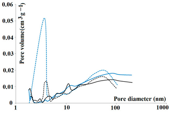 Pore size distributions on adsorption (solid lines) and desorption (dashed lines) branches of isotherms of all tested materials: m-MIP (blue) and m-NIP (black).