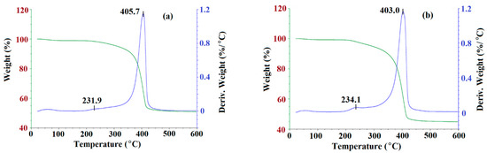 As can be seen, the decomposition patterns for m-MIP and m-NIP were very similar (Figure 4). The process started at about 210 °C and continued until 450 °C. The decomposition step consisted of two stages. First, a maximum of weight loss was observed at 231.9 °C and 234.1 °C for m-MIP and m-NIP, with the loss of 4% of total mass. Second, a maximum was observed at 405.7 °C and at 403.0 °C for m-MIP and m-NIP, respectively, with the loss of the initial mass of material being equal to 49.1% for m-MIP and to 55.1% for m-NIP. It could be supposed that the initial decomposition was attributed to the short chain degradation, as well as to the decarboxylation process, which was also responsible for stable decomposition in the range of 300–450 °C. It should be underlined that, in the decomposition process, the organic polymeric layer derived from methacrylates (methacrylic acid (MAA), ethylene glycol dimethacrylate (EGDMA), and 3-(trimethoxysilyl)propyl methacrylate (MPS)) was involved. The short maximum of weight loss at 50–55 °C could be explained by the loss of intrinsically bound water. The results proved that 50.9% of the m-MIP and 44.9% of m-NIP consisted of non-decomposed components. Iron and silicon oxides have melting points above 1000 °C, and both were highly stable in the studied temperature range: 25–600 °C [34].