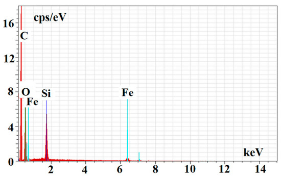 The EDS analysis confirmed the proceeding of the polymer layer on the magnetite core. The following values of %wt of C, O, Si, and Fe were obtained for m-MIP: 51.14 ± 7.44, 32.58 ± 4.74, 9.80 ± 1.43, and 6.48 ± 0.94, and for m-NIP: 56.35 ± 8.19, 26.96 ± 3.92, 10.06 ± 1.46, and 6.63 ± 0.96, respectively.
