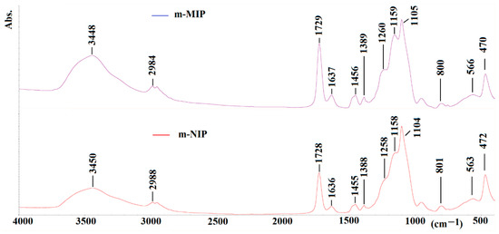 Finally, the infrared (FTIR) analysis was employed to prove the structure of the obtained materials. The spectra of m-MIP and m-NIP are presented in Figure 6.