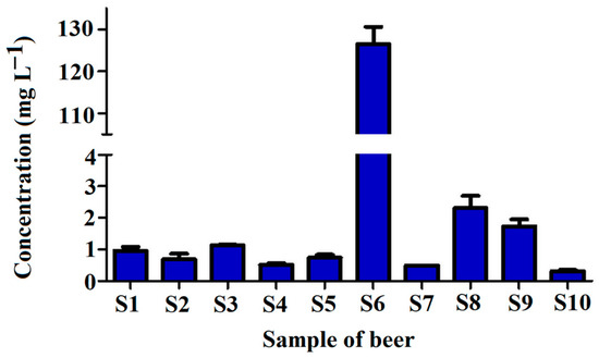 As can be seen, the concentration of tyramine in beer samples varied significantly. Mostly, the compound levels were in the range between 0.303 and 2.307 mg L−1, except for the sample S6, with a tyramine concentration as high as 126.5 mg L−1. The highest tyramine content in S6 is related to the presence of coffee (that contains tyramine intrinsically) in the sample [37].