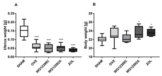 The animals were either sham-operated (n = 8) or ovariectomized. Ovariectomy was performed under general anesthesia. Mice received an intraperitoneal injection of buprenorphine at the dose of 0.2 mg/kg (VET-AGRO, Lublin, Poland) and were anaesthetized with a mixture of synthetic air and isoflurane (4% for induction and 2–3% v/v for maintenance; 200 mL/min; Aerrane isoflurane, Baxter, Guayama, Puerto Ricoc, IL, USA). To induce the estrogen deficiency, ovariectomy was performed by removing both ovaries through the dorsal approach, and the wounds were closed with soluble surgical sutures. Mice that underwent the same surgical procedure without removing the ovaries (SHAM) served as a control. Twenty-four hours after the surgery, buprenorphine (0.1 mg/kg) was injected. The OVX mice were randomly divided into four groups (n = 8, each): Untreated ovariectomized mice (OVX), and mice treated with WG12399C, WG12592A, or zoledronate (ZOL). The animals were kept in gangs of four individuals. Ten days after the surgery, mice started receiving the treatment. Mice were administered intravenously with vehicle (saline), WG12399C 60 mg/kg, WG12592A 6 mg/kg, or zoledronate 120 μg/kg divided into six weekly doses. The doses applied in the study were based on previous toxicological tests and did not cause any clinical signs of toxicity. After 56 days from ovariectomy, mice were anesthetized, and blood samples were obtained for further analyses. The animals were then euthanized by cervical translocation. The femurs and tibias were collected post mortem. For micro-computed tomography (μCT) analysis, bones were immediately frozen and stored in −80 °C, while for histological studies, bones were fixed in 70% ethanol.