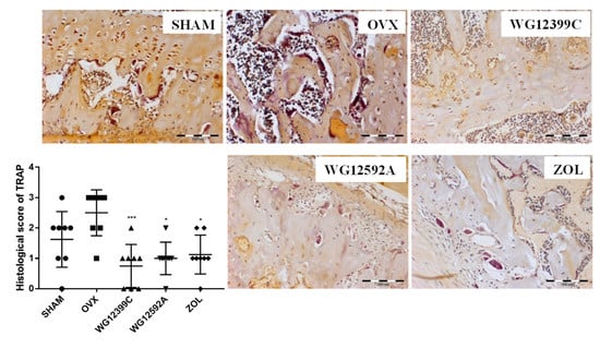 40]. However, the exact nature of the effect of BPs on osteoclast number, activity, and life-span remains inconclusive. In our present study, the staining for TRAP activity showed an elevated number of active osteoclasts in distal tibial metaphysis in OVX mice as compared to that in sham-operated animals. Treatment with WG12399C or WG12592A significantly reduced the number of large multinucleated TRAP-positive cells when compared with that in OVX mice. These changes were at comparable level to those observed for the reference zoledronic acid.
