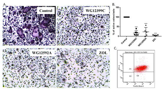 46]) were 9 µM for WG12399C and 4.5 µM for WG12592A, thus 10 times higher than the doses applied in osteoclastogenesis assay. Untreated cells and cells treated with 0.345 μM zoledronic acid served as controls. Media were replaced every alternate day, and cultures were maintained for eight days. Next, the cells were stained for tartrate-resistant acid phosphatase (TRAP) using an Acid Phosphatase Leukocyte Kit (Sigma-Aldrich) according to the manufacturer’s instructions and counterstained with hematoxylin solution Gill No. 3. Microscopic examination was performed and photographs were captured at 100× magnification using a bright field microscope (Olympus IX81) connected to a camera equipped with Olympus Stream Image Analysis software (Olympus Europe Holding GmBH, Hamburg, Germany). TRAP-positive cells with at least three nuclei were counted as osteoclasts. The number of active osteoclasts in the BP-treated groups was compared to the values in the control wells. Two wells were assessed per treatment in five independent experiments.