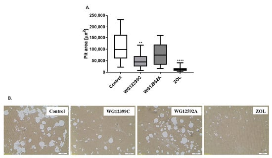 A total of 2 × 103 differentiated BMDMs were seeded in 24-well Corning Osteo Assay Surface Microplates (Corning Inc., Corning, NY, USA) in α-MEM supplemented with 10% FBS and treated with 0.919 μM WG12399C or 0.421 µM WG12592A in the presence of 30 ng/mL M-CSF and 40 ng/mL RANKL. Untreated cells and cells treated with 0.345 μM zoledronic acid served as controls. Media were replaced every alternate day, and cultures were maintained for 10 days. Subsequently, osteostrips were sonicated for 15 min and washed with distilled water. Microscopic examination was performed and microphotographs were captured at 100× magnification with a bright field microscope. The area of resorption pits was measured using Olympus Stream Start 1.6.1 program (Olympus). The area of resorption pits in the BP-treated groups was compared to the values in the control wells. Two wells were assessed per treatment in seven independent experiments.