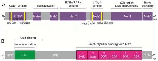 Nrf2 is a 605 amino acid protein that has seven functional domains called Neh (N2-erythroid-derived Cap ’n’ Collar homology) domains presented in Figure 1A. The Neh1 domain contains a basic region-leucine zipper motif binding as well as the sequence for heterodimerization with small Maf transcription co-activators. The Neh2 domain possesses two motifs, 29DLG31 and 79ETGE82, through which Nrf2 binds to the repressor, the Keap1 homodimer that promotes Nrf2 ubiquitination and 26S proteasomal degradation. The third DIDLID (17–32 aa) motif in the Neh2 domain is indispensable for Neh2 activity and appears to be necessary to recruit a ubiquitin ligase to the protein [44]. In the C-terminal, the Neh3 domain is a transcriptional co-activator that recruits chromodomain helicase DNA-binding domain protein 6 (CHD6) [45]. The Neh4 and Neh5 domains act synergistically to recruit transcriptional co-activators, the CREB-binding protein (CBP), and/or repressor-associated coactivator (RAC) [46]. The Neh6 domain contains two motifs, DSGIS and DSAPGS, degrons for Keap1-independent Nrf2 degradation through the β-transducin repeat-containing protein (β-TrCP), creating a complex with the S-phase kinase-associated protein 1 (Skip1)-Cul1-Rbx1 E3 ubiquitin ligase [17]. Finally, the Neh7 domain mediates the repression of Nrf2 by retinoid X (RXRs) and retinoic acid (RARs) receptors, which prevent the binding of the transcription co-activators to the Neh4 and Neh5 domains [47].