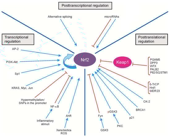 Transcriptional, posttranscriptional and posttranslational regulation of Nrf2 activity. The transcription of Nr2 is regulated by the transcription factors, oncogenes (KRAS, Myc, Jun) and modifications of the Nrf2 promoter (hypermethylation or SNPs). Posttranscriptional regulation includes alternative splicing and microRNA binding. The posttranslational control of Nrf2 activity results from protein modifications, protein degradation and protein–protein interactions. Arrows and blunt ends indicate activation and inhibition, respectively. ROS, reactive oxygen species; SNPs, single nucleotide polymorphisms; Akt, serine/threonine-protein kinase; BRCA1, breast cancer susceptibility 1; PI3K, phosphoinositide 3-kinase; NF-κB, nuclear factor-κB; AhR, aryl hydrocarbon receptor; Fyn, tyrosine-protein kinase Fyn; GSK-3, glycogen synthase kinase-3; pGSK-3, phosphorylated glycogen synthase kinase-3; KRAS, GTPase KRas; Myc, Myc proto-oncogene protein; Jun, transcription factor AP-1; AP-2, activating enhancer-binding protein 2; Sp1, specificity protein 1; PKC, protein kinase C; CK-2, casein kinase 2; β-TrCP, β-transducin repeat-containing protein; Hrd1, HMG-CoA reductase degradation 1; WDR23, WD-repeat protein 23; PGAM5, phosphoglycerate mutase 5; DPP3, dipeptidyl peptidase 3; WTX, Wilms tumor gene on the X chromosome; PALB2, partner and localizer of BRCA2; p21, cyclin-dependent kinase inhibitor 1; p62/SQSTM1, sequestosome 1. Figure adapted from [67].