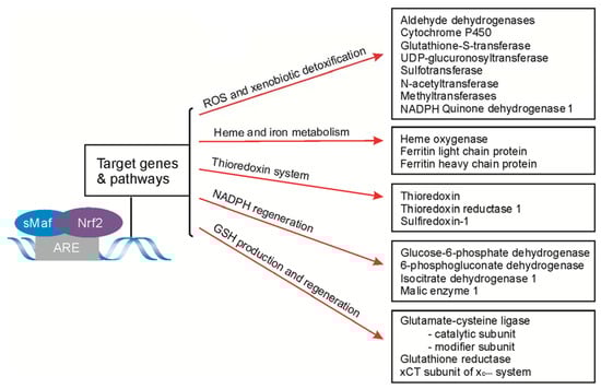 The Nrf2/ARE pathway controls dozens of genes of enzymes participating in fundamental cell-rescue mechanisms. In relation to the specificity of their action, they can be classified into five categories (Figure 3). The first group of Nrf2/ARE-dependent genes encodes the proteins involved in ROS and xenobiotic detoxification. This group includes a wide range of enzymes starting from phase 1 detoxification, such as the family of aldehyde dehydrogenases, NQO1 and cytochrome P540, through the enzymes of phase 2 conjunctive enzymes (glutathione S-transferase (GST), UDP-glucuronosyltransferase (UGT), sulfotransferases, N-acetyltransferases, and methyltransferases) [83], ending with the transporters of the ATP-binding cassette protein superfamily (ABC) taking part in excretion, or the import of various molecules across the cell membranes [84]. The second cluster of genes controlled by the Nrf2/ARE pathway is the group for GSH-produced and GSH-regenerated enzymes that control cellular redox homeostasis. These include rate-limiting in the synthesis of GSH glutamate-cysteine ligase subunits: the catalytic subunit (GCLC) and modifier subunit (GCLM), glutathione reductase (GS), and the cystine/glutamate transporter (xCT) subunit of the xc− system that supply cysteine to cells for GSH synthesis [85,86]. The third group consists of genes encoding the proteins responsible for heme and iron metabolism. To this group belongs HO-1, catalyzing heme molecule breakdown, and subunits of the ferritin complex, responsible for iron transport and storage: a ferritin light-chain protein encoded by the FTL gene, and a ferritin heavy polypeptide that is a ferroxidase enzyme encoded by the FTH1 gene. The other Nrf2/Maf dimer target genes are those for NADPH-regenerated enzymes, which include glucose-6-phosphate dehydrogenase (G6pd), 6-phosphogluconate dehydrogenase (Pgd), isocitrate dehydrogenase 1 (Idh1) and malic enzyme 1 (Me1) [87]. The last group of Nrf2-dependent genes is those encoding the thioredoxin (TXN)-based antioxidant system, composed of TXN, thioredoxin reductase 1 (TrxR), and sulfiredoxin 1 (Srx1), that maintain protein thiols in a reduced state [88]. Finally, Nrf2 has the ability to induce the expression of diverse genes with cytoprotective activity; thus, it plays a pivotal role in cell response to various stimuli, allowing cellular adaptation and maintaining homeostasis.