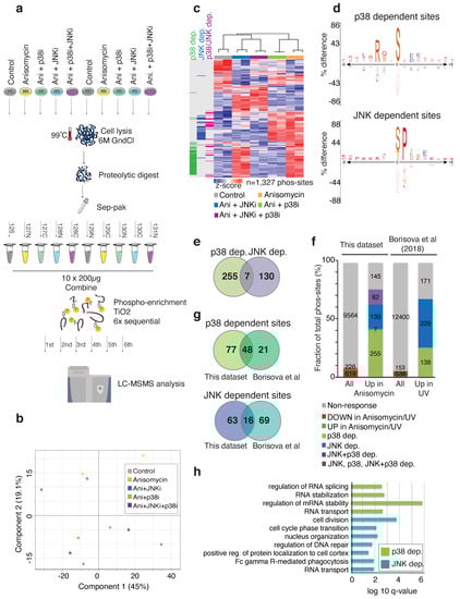 - Borisova, M.E.; Voigt, A.; Tollenaere, M.A.X.; Sahu, S.K.; Juretschke, T.; Kreim, N.; Mailand, N.; Choudhary, C.; Bekker-Jensen, S.; Akutsu, M.; et al. p38-MK2 signaling axis regulates RNA metabolism after UV-light-induced DNA damage. Nat. Commun. 2018, 9, 1017. [Google Scholar] [CrossRef] [PubMed] [Green Version]