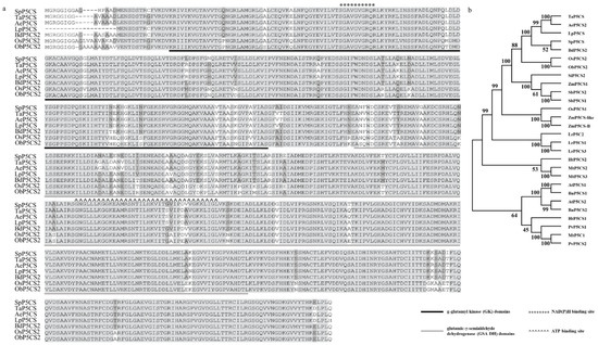 Sequences analysis of SpP5CS. (a) Multiple sequence alignment of SpP5CS and homologous proteins from other species. Legend shows the γ-glutamyl kinase (GK; 30–275 bp) and glutamic-γ-semialdehyde dehydrogenase (GSA DH; 299–600 bp) domains; (b) A phylogenetic tree constructed using SpP5CS and P5CS proteins from other plant species. BdP5CS2 (B. distachyon, XP_003564608.1), LpP5CS (L. perenne, AGQ04179.1), TaP5CS (T. aestivum:KAF7024610.1), AeP5CS2 (A. tauschii, XP_020198194.1), OsP5CS1 (O. sativa, O04226.2), OsP5CS2 (O. sativa, BAB64280.1), ObP5CS2 (O. brachyantha, XP_006645010.2), ZmP5CS1 (Z. mays, AQK99427.1), ZmP5CSB(Z. mays, AQK86404.1), ZmP5CSB-like (Z. mays, NP_001339256), SbP5CS1 (S. bicolor, ACU65226.1), SbP5CS2 (S. bicolor, ACU65227.1), AtP5CS1 (A. thaliana, P54887.1), AtP5CS2 (A. thaliana, P54888.1), HtP5CS1 (H. tuberosus, AHJ08569.1), HtP5CS2 (H. tuberosus,AHJ08570.1), LrP5CS1 (L. regale, KT972374), LrP5CS2 (L. regale, KT972375), LrP5CS3 (L. regale, KT972376), MtP5CS1 (M. truncatula, CAC82184.1), MtP5CS2 (M. truncatula, AET87351.1), MtP5CS3 (M. truncatula, AET35478.1), PvP5CS1 (P. vulgaris, ABY61079.1), PvP5CS2 (P. vulgaris, ABY89287.1), BnP5CS1 (B. napus, AF314811), BnP5CS2 (B. napus, AF314812) and SiP5CS2 (S. italica, XP_004970573.1).
